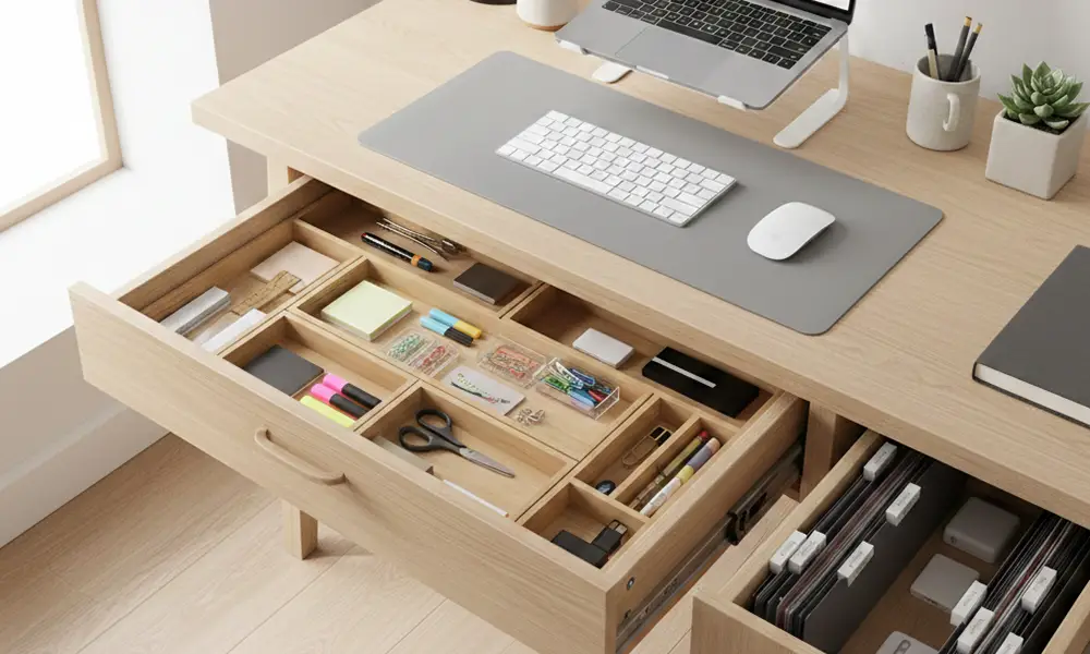 A boa notícia é que, quando o mobiliário ajuda, o esforço diminui muito. Divisórias internas nas gavetas fazem diferença porque evitam aquele acúmulo silencioso de cabos, papéis e acessórios soltos. Quando cada item tem um espaço definido, guardar deixa de ser tarefa e vira movimento automático.