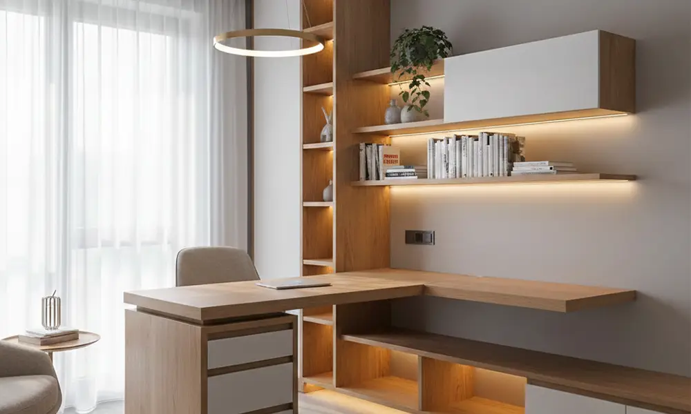 Luminárias minimalistas com foco direcionável funcionam bem quando ajustadas corretamente. Spots no teto ou perfis de LED embutidos nos móveis planejados iluminam a superfície de trabalho sem ocupar espaço útil. Já as fitas de LED integradas a nichos ou painéis ajudam a criar profundidade visual e suavizar o ambiente, especialmente em home offices integrados à sala ou ao quarto.