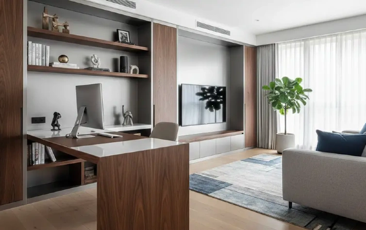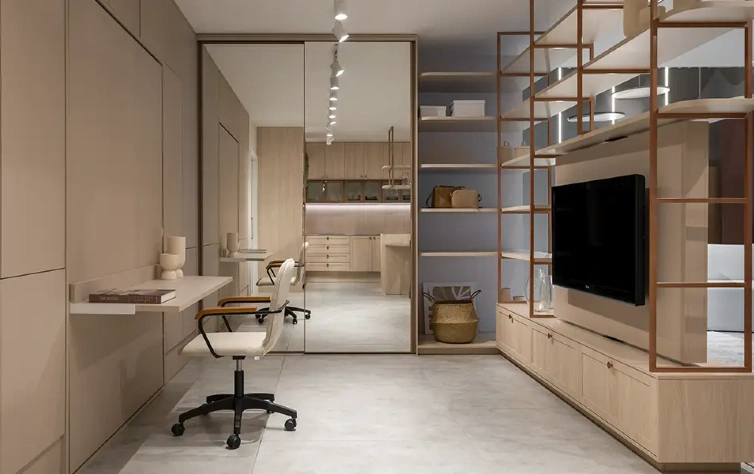 No layout integrado, o escritório planejado compartilha espaço com a sala de estar, quarto ou outro ambiente social. Aqui, o desafio vai além da funcionalidade: é preciso equilibrar uso profissional e estética residencial.
